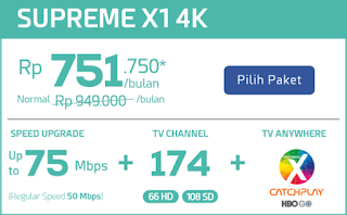 Harga promo Rp.724.130/bulan untuk 12 bulan. Harga Sudah temasuk ppn dan sewa perangkat dekoder,router dan modem.