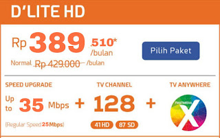 Harga promo Rp.389.510/bulan untuk 12 bulan. Harga Sudah temasuk ppn dan sewa perangkat decorder,router dan modem.